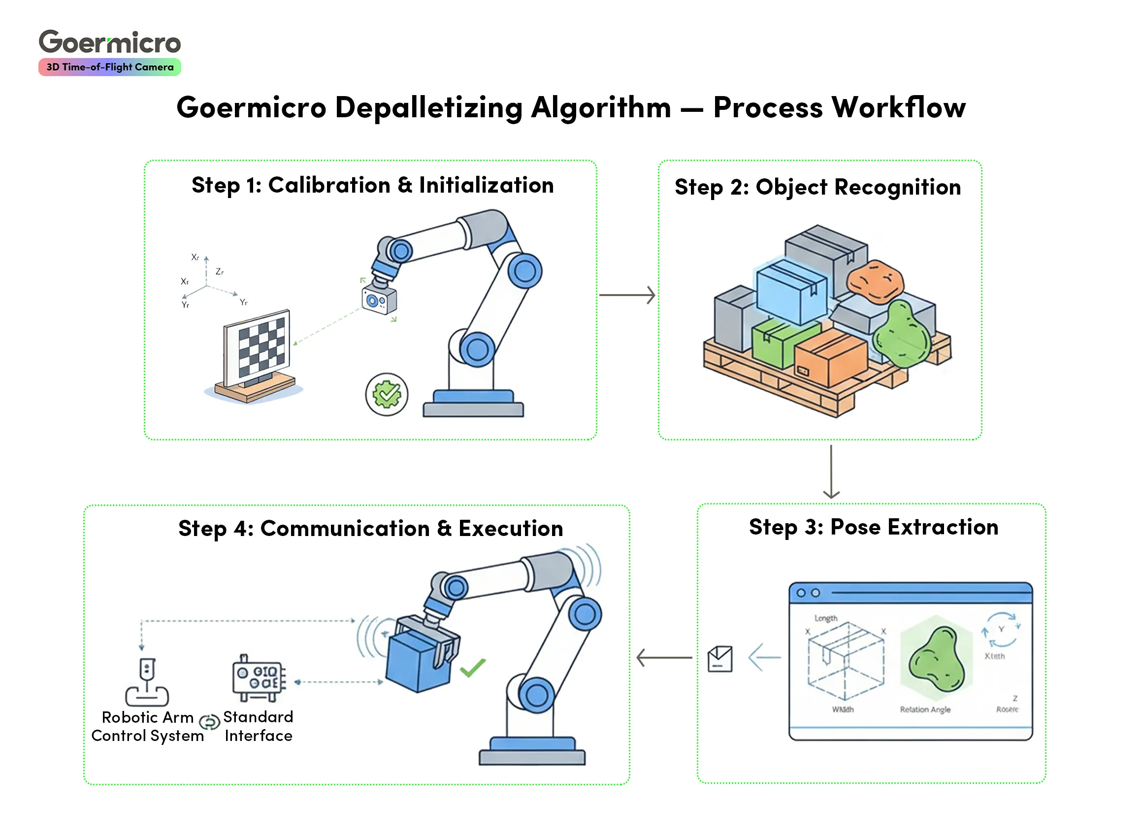 Addressing these pain points, the Goermicro 3D ToF team leverages its deep heritage in optical sensing to launch the Proprietary 3D ToF Vision-Guided Automated Palletizing and Depalletizing Solution.